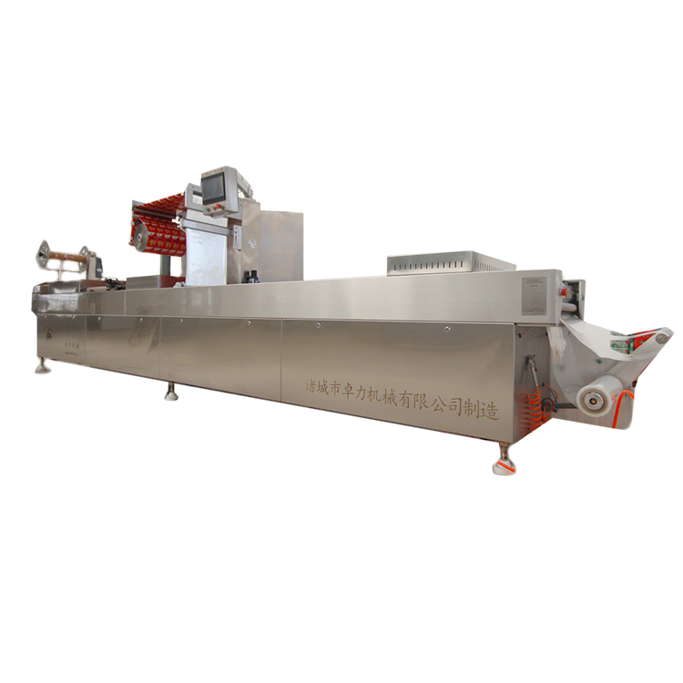 成型室由上、下工作室以及與所包裝產(chǎn)品對(duì)應(yīng)的成型模具等組成。上工作室由螺栓固定在機(jī)架上,下工作室在氣缸的帶動(dòng)下,可以上下往復(fù)運(yùn)動(dòng)。上工作室內(nèi)裝加熱板。成型加熱溫度通過溫控儀和熱電耦控制。用戶可以在觸摸屏上很方便的設(shè)定成型溫度。先下工作室上行到達(dá)它的上位置。上、下工作室通過硅膠密封墊完全密封后,加熱板對(duì)底膜加熱至設(shè)定的成型溫度,然后下工作室抽真空。已加熱的底膜受拉伸,沉入成型模成為與被包產(chǎn)品對(duì)應(yīng)的幾何形狀。使用的底膜質(zhì)量,材料和厚度、硬度不同,成型溫度也不同,合理的成型溫度由試驗(yàn)確定。
