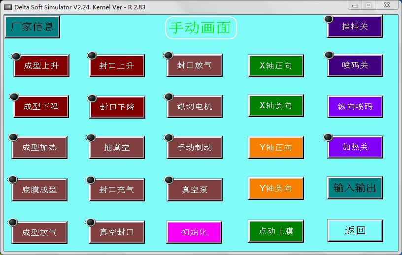 拉伸膜真空包裝機【手動畫面】主要用于機器的手動操作,有【廠家信息】【輸入輸出】兩個切換畫面,有【加熱開】【噴碼開】【擋料開】三個開關(guān)鍵和一個【初始化】按鍵。還有【成型上升】【成型下降】等二十個點動觸摸鍵。如下圖: